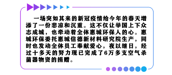 隨后,裝載五萬支殺菌器的車輛啟動,它將承載全體惠城環(huán)保人的愛心,駛達最急需的防疫一線。