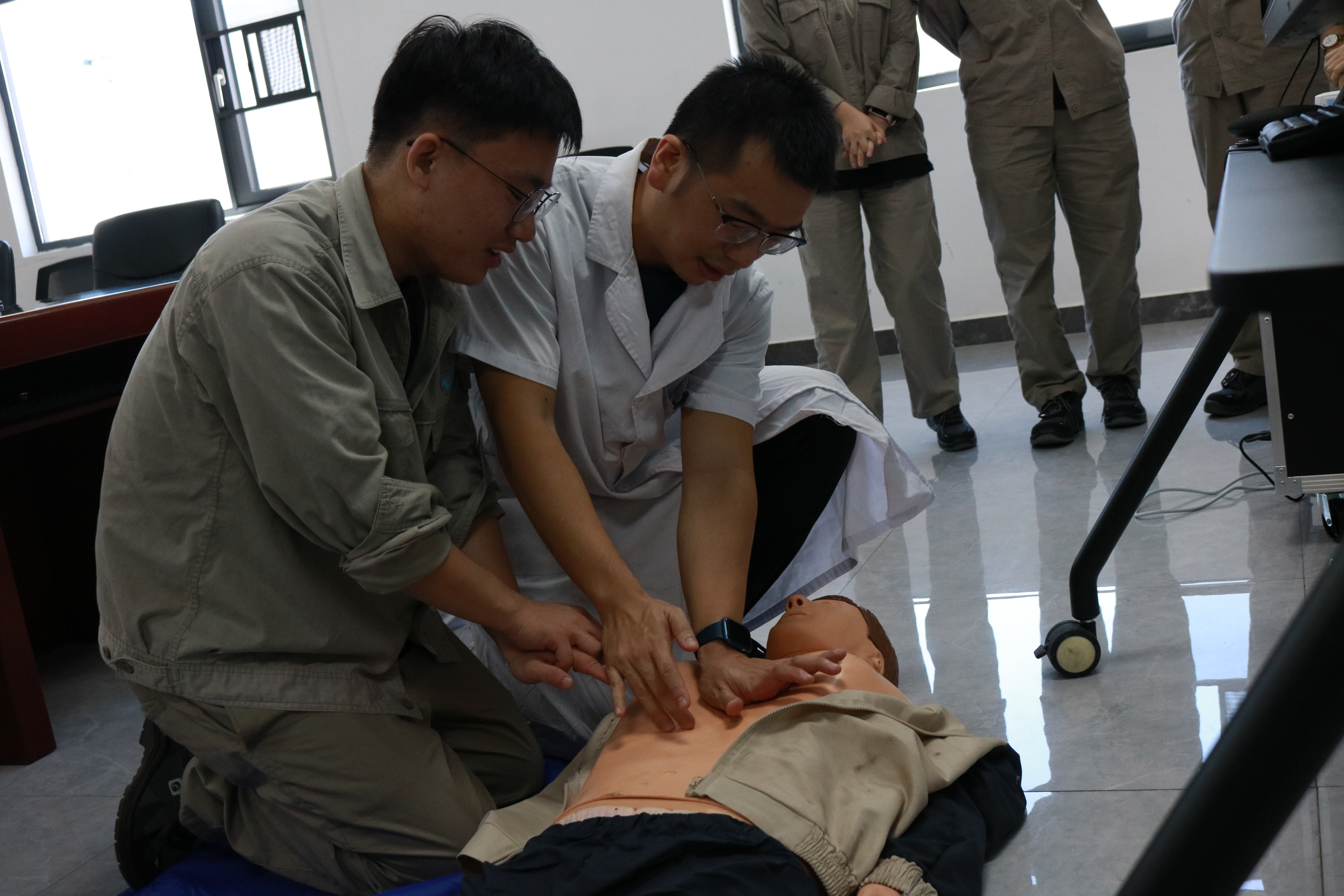 理論講解結(jié)束后,進(jìn)入模擬操作和現(xiàn)場(chǎng)指導(dǎo)環(huán)節(jié)。陳宏主任用模擬人演示了完整的CPR流程,隨后,員工們進(jìn)行實(shí)操練習(xí),陳宏主任悉心指導(dǎo)每位員工的操作,對(duì)不規(guī)范的動(dòng)作進(jìn)行耐心的示范和糾正,員工及時(shí)規(guī)范急救動(dòng)作,反復(fù)操作,直到掌握正確方法。